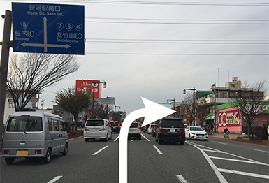 新潟駅南口を背にして、弁天I.C方面へ直進します。